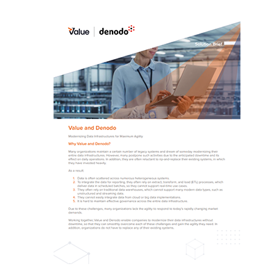 Together, Denodo and Value allow companies to modernize their data infrastructures by drastically reducing downtime, in order to overcome any challenge, achieving the necessary agility. Furthermore, businesses are not obliged to replace existing systems.